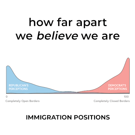 We asked members of each party to rate their own views on immigration. We did not ask about specific policies, but rather about general preference for closed or open borders, noting that many people are not in either extreme. In our survey, 0 means keeping all borders completely open to all migrants and 100 means keeping all borders completely closed to all migrants. We also asked them to estimate how the average member of the other party would answer the same question. In our samples, Democrats had a median score of 35, but Republicans estimated that Democrats would have a median score of 9. Meanwhile, Republicans had a median score of 75, while Democrats estimated Republicans would have a median score of 92.