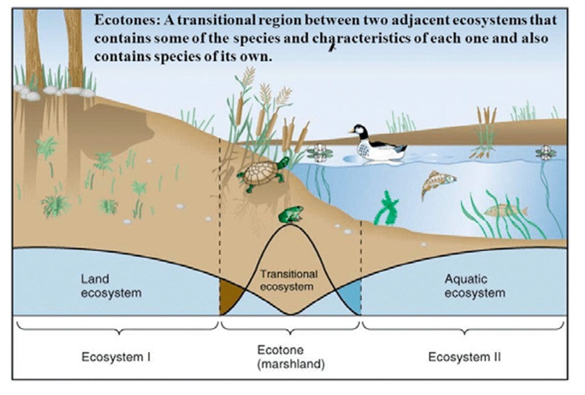 A blurry place in between two spaces, an edge, an ecotone! As I dug more into the ecotone, I learned how this interstitial space between two ecosystems creates a large amount of biodiversity and thus, resilience. Biodiversity strengthens ecosystems by ensuring that a wide range of species can adapt to changing conditions, making the system more robust and flexible. This ecological concept opened up a whole world of metaphors for me.