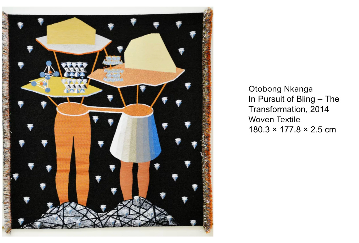 Minerals play a central role in Nkanga’s exploration of commodities. She often uses or depicts minerals like mica, which sparkles in makeup products but has a dark origin rooted in human and environmental exploitation. In Pursuit of Bling: The Transformation (2014), Nkanga examines how the glittering appeal of mica contrasts with the ecological damage and human labor it requires. The piece features male and female figures tied together at the waist, connected to rock formations and floating jewels, visually linking the earth’s resources to human consumption.